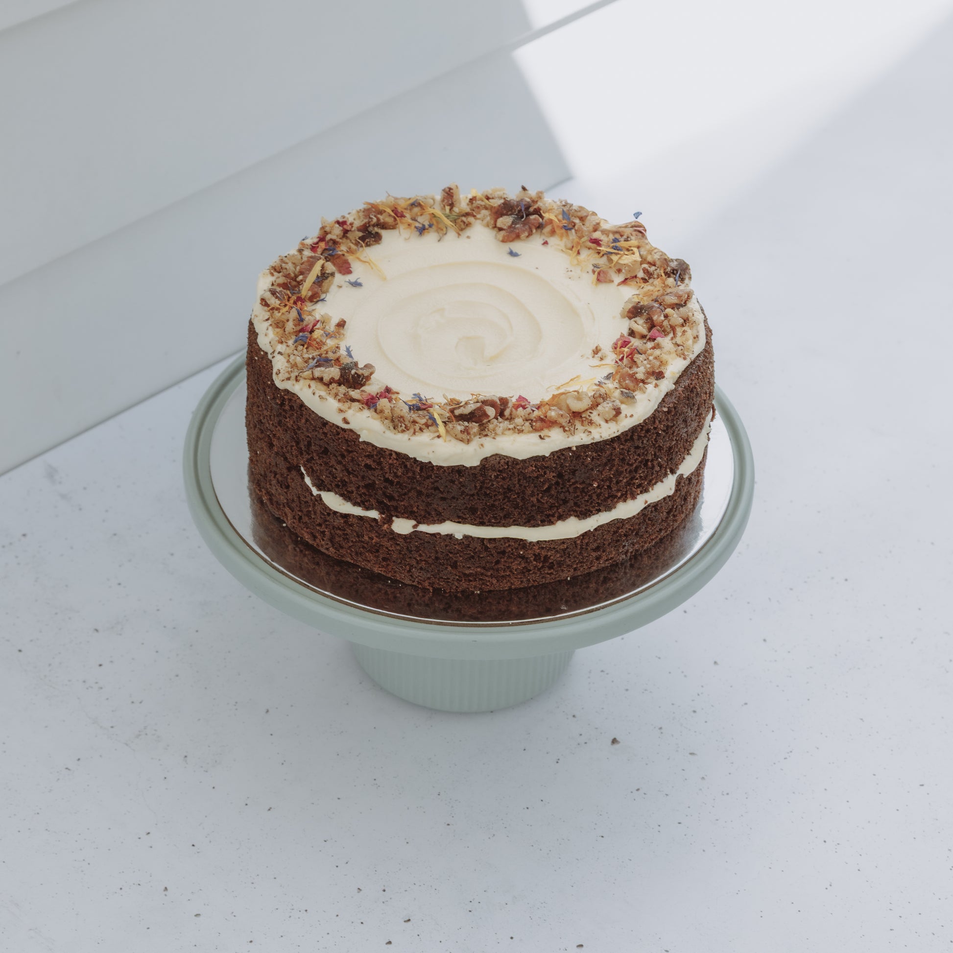 A moist carrot cake infused with warm cinnamon and layered with creamy cream cheese icing. Topped with toasted walnuts and delicate dried edible flowers for the perfect harmony of sweet and spice.