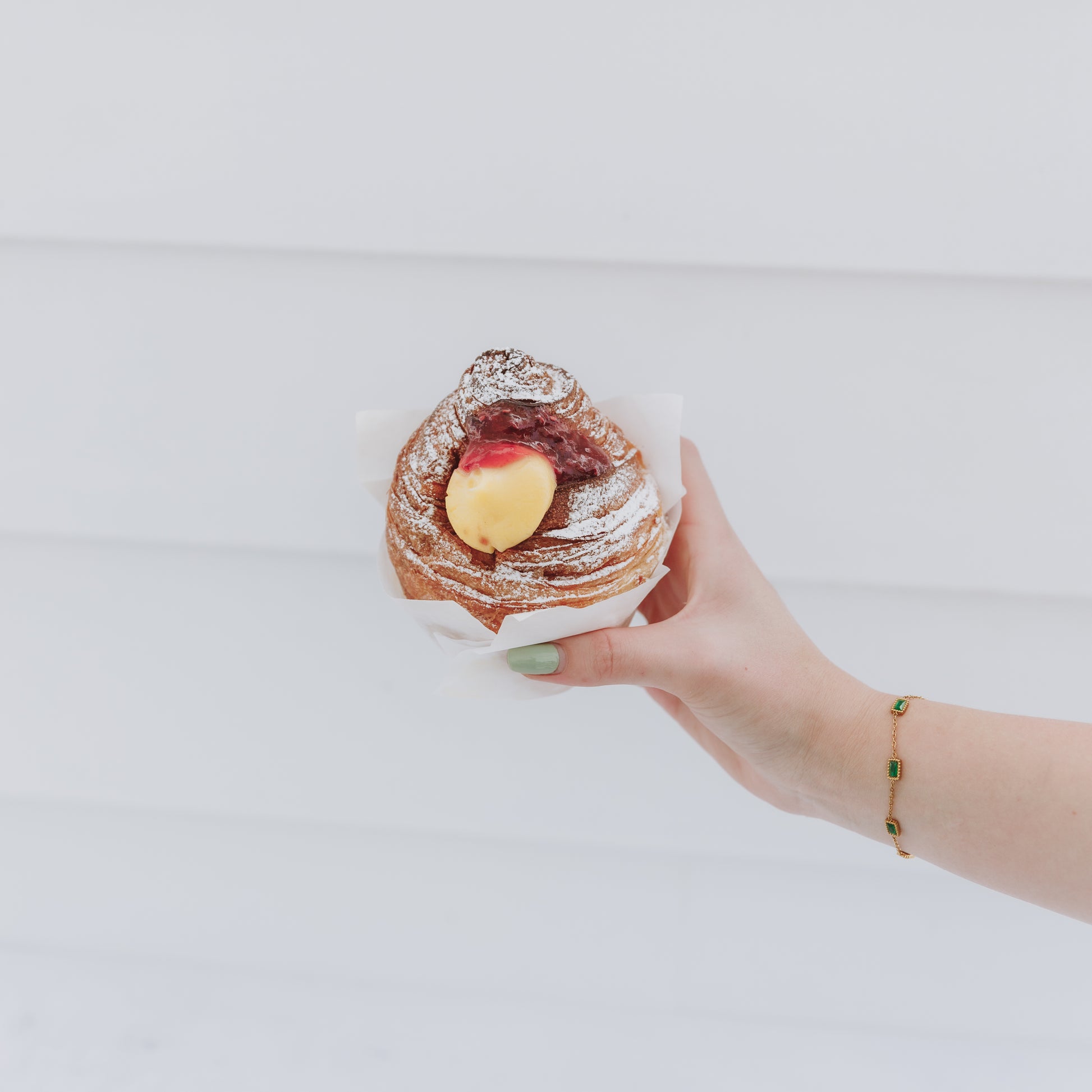 A delicious flaky muffin shaped croissant scroll, filled with smooth vanilla custard and jam. Fillings vary daily.