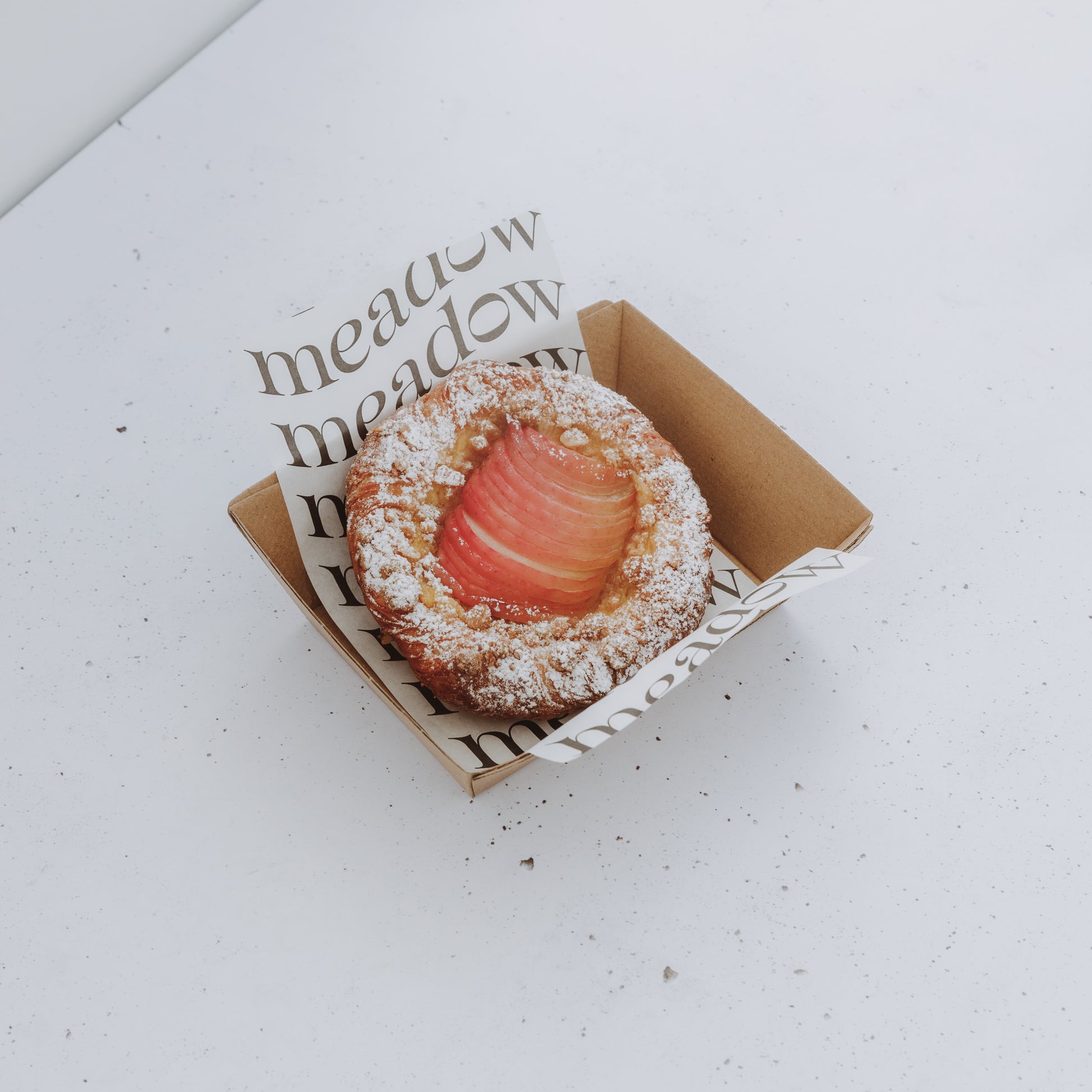 Buttery, flaky croissant pastry layered with smooth custard and topped with fresh fruit. Flavours vary daily.