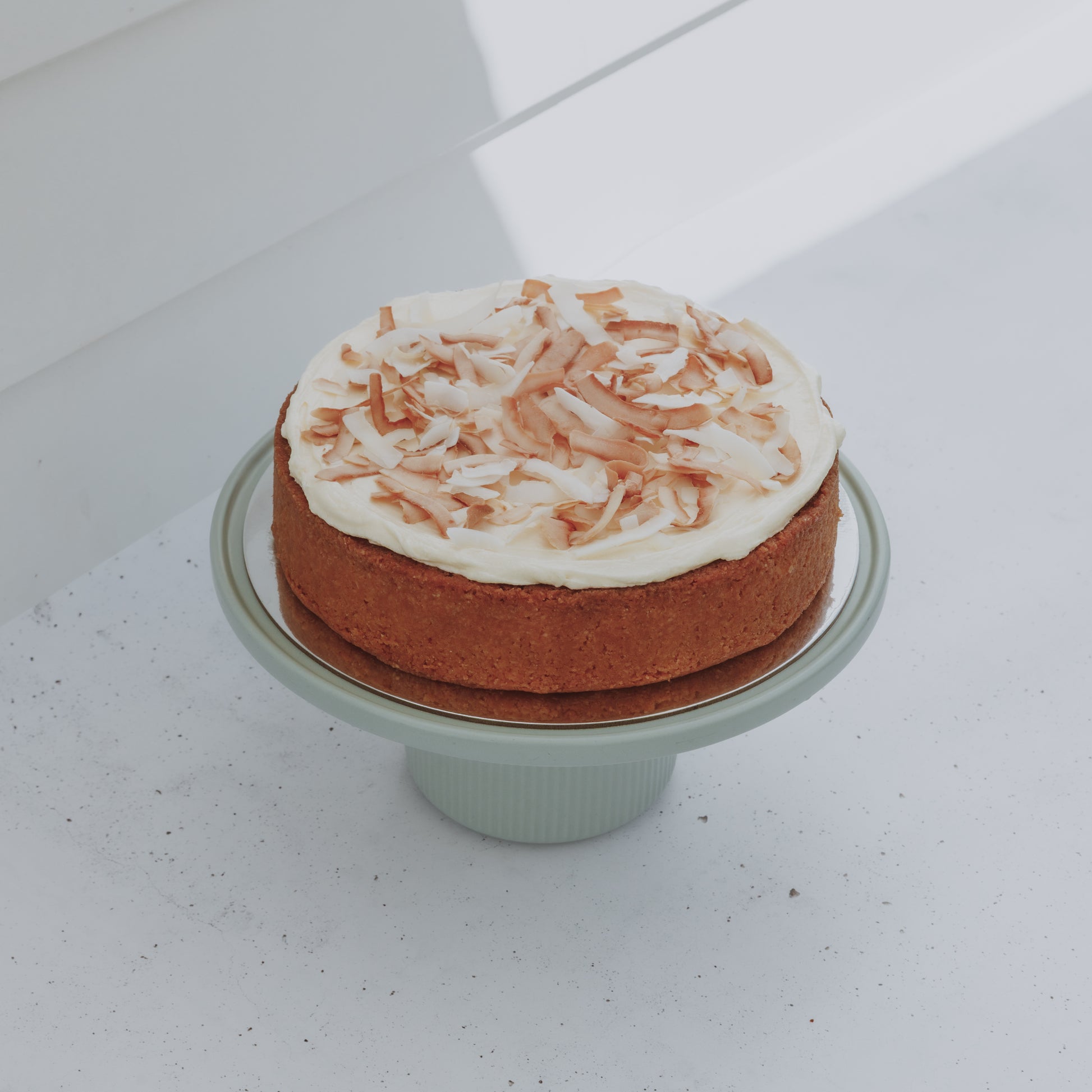 A moist lemon and coconut cake, infused with lemon syrup and finished with cream cheese icing and toasted coconut flakes.